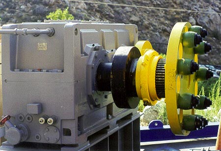 Just prior to installation, the main drive gear box and coupling to the main drive wheel are pictured in this view.  The 1100Hp DC drive motor provides the input power to this unit.