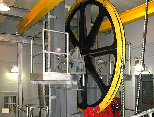 The wheel pictured here allows two cable-wraps around the main drive wheel for adequate friction to pull the cables. It also provides braking once the cabin is in dock.